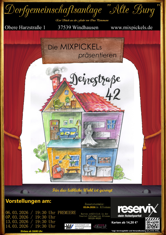 Die Handlung: Ein Haus, das überall sein könnte. Allerdings mit der Hausnummer 42 - jene Zahl ist ja seit 1978 durch Douglas Adams Buch „Per Anhalter durch die Galaxis“ die Antwort auf alle Fragen. Im Haus „Deinestraße 42“ leben unterschiedliche Charaktere mit- und nebeneinander. Doch das Gefüge gerät durch einen neuen Mieter und die u.a. daraus entstehenden Entwicklungen der alten Mieter durcheinander. Es dreht sich zum einen um gegebene Versprechen, deren Umsetzung und Einhalten, aber auch um Sehnsüchte und Wünsche, die ein Menschenleben auszeichnen. Allerdings gibt es auch traurige Momente im Haus und die verschiedensten Spielarten der Liebe. Wir freuen uns auf Ihre/euren Besuch und wünschen viel Spaß und gute Unterhaltung.